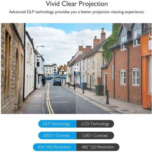This projector is compact and lightweight. It is pretty convenient and portable to be carried along in your pocket wherever you go, which is ideal for outside activities like small meetings, gatherings or gaming time. It is also easy to use. The built-in rechargeable 4000mAh battery brings truly wire-free viewing experience. Based on excellent battery performance, you can enjoy more than 2 hours of non-stop movie playing without charging. Through the WIFI connection function, you can easily connect your smartphone to the small projector for multiscreen. You don’t need any other adapters, it is very easy to share your movies with your family and friends.