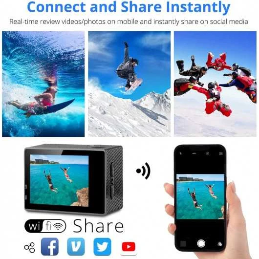 100FT Waterproof Action Camera: Place your camera into the waterproof case and securely fasten it, you can dive below 100ft (30m). Underwater cameras is ideal for water sports such as swimming, surfing, diving, snorkeling etc.