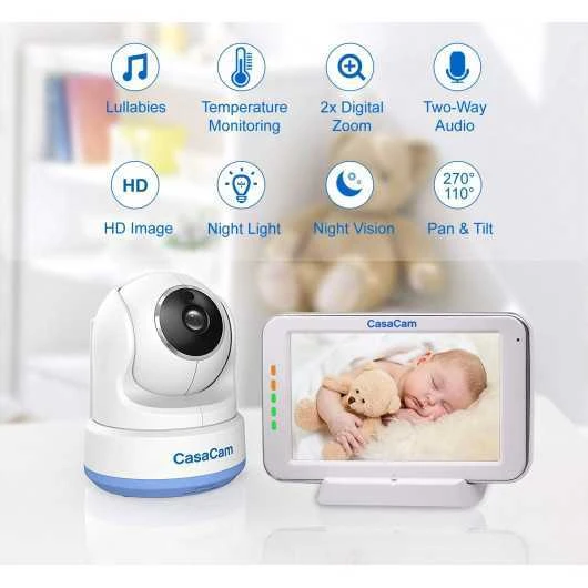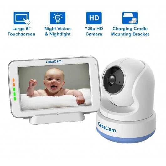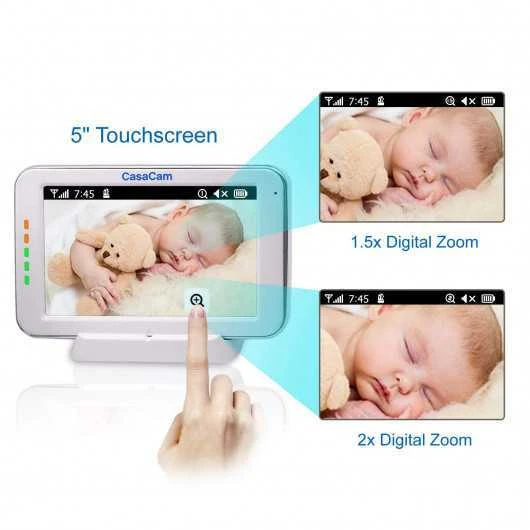 The Casacam baby monitor has a 5” touchscreen with a full color LCD display and a digital zoom you can use to get a closer view. You don’t miss a thing that is happening in your baby’s room thanks to the big screen. You can add up to four cameras to the system and monitor them thanks to the user friendly interface. You can take the monitor anywhere with you as it is very portable and watch up to four rooms on one device.