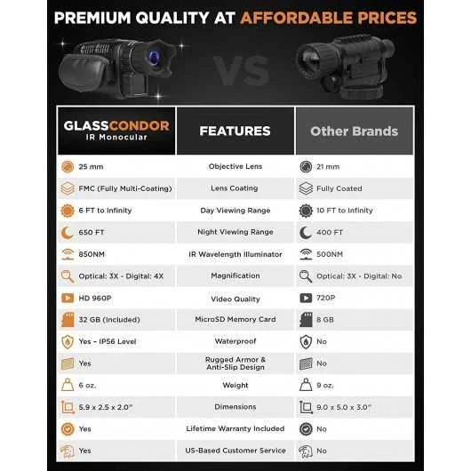 CREATIVE XP GlassCondor is a monocular that features a 25mm multi-coated lens with 850 NM infrared illuminator, 3X optical, 4X digital zoom, 1.5 inch TFT display ideal for hunting, camping, fishing, farm safety or outdoor recreation.