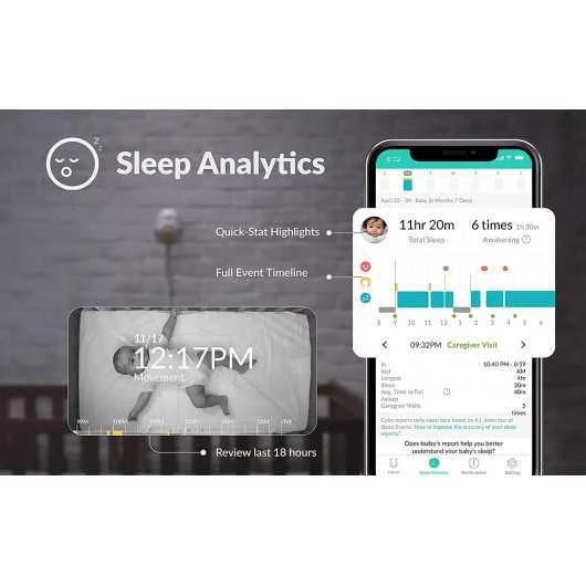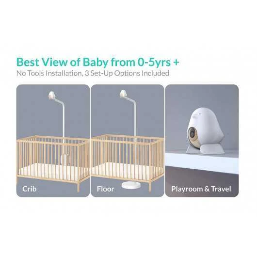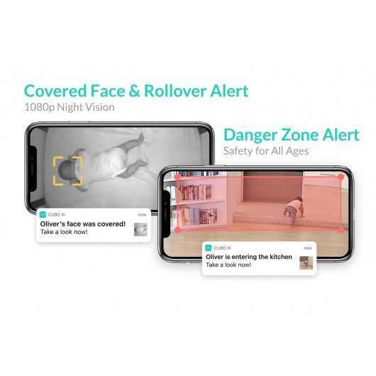 Cubo Ai Plus is a monitor that provides sleep safety with covered face and danger zone alerts. It uses AI to detect if your baby’s mouth and nose are covered by items or if your baby is stuck rolling over. You don’t need any wearables. The camera has a 1080p night vision and 2-way audio with cry and temperature and humidity detection. You also get an auto photo capture function and 18-hour playback with no blinking red light.