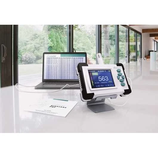 It is easy to use and requires only a few minutes to offer the first measurements, it has a color screen with several control buttons to facilitate navigation through the various functions offered. The 3.2 inch TFT screen offers 4 levels of brightness and displays the date, time, different measurements and also the level of air quality via a color pad that degrades from green of less than 450 ppm for fresh air to red of more than 5000 ppm for asphyxiating air. It is also equipped with an automatic shutdown function adjustable from 15 minutes to 8 hours of function.