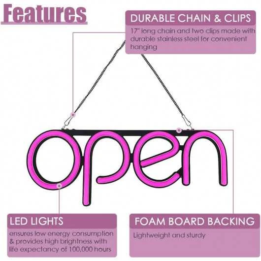 It is a purely handmade product made of sturdy materials, the light strips are made of PVC with pink LEDs with a life span of more than 100,000 hours requiring no maintenance. The foam panels imitating the word OPEN are connected to a main panel with two rings to attach the stainless steel chain, it comes with a power supply box that plugs directly into your power outlets.