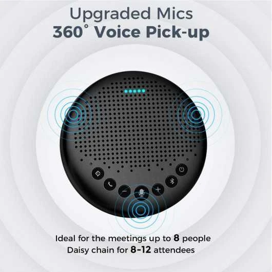 You can chain two eMeet devices via a Daisy Chain cable, used for conferences with up to 12 people. It is small and fits easily into your bags so you can take it with you wherever you go. It supports different conferencing platforms including Zoom, Skype, WebEx, Goto Meeting, Google Hangout, Facetime, etc. on both Windows and Mac OS devices.