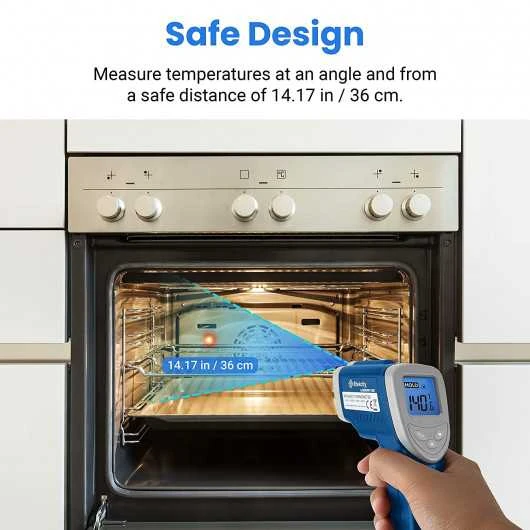 The measuring surface is about 2cm below the infrared aiming point. 2.For best accuracy, the distance between the thermometer and object of measurement should approximately be 14.17inches (36cm). Simple Operation – Point and Click! This Etekcity non-contact IR temperature gun is easy to operate. It turns on and begins reading the temperature with one press of the trigger. Clear text displays the measured temperature in either Celsius or Fahrenheit. A laser light aids in aiming, and can be turned on or off. In addition, the readout display features a backlight which can be turned on if needed. 12: 1 High distance spot ratio! This means you may measure the temp of a smaller area at the same distance compared to other 8: 1 thermometers; thus the readings are much more accurate! Reliable Product This is a big seller in and many respected institution like Car Magazines, Airports, Universities purchase this product from us! You deserve it! 3.Specifications Temperature Range: -58℉~1022℉(-50℃~550℃) Accuracy: 2% Distance Spot Ratio: 12:1 Emissivity Adjustable: 0. 95(fixed) Response Time and Wavelength: 500ms and (5-14)um Repeatability: 1% or1℃ Resolution: 0. 1℃ or 0. 1℉ Package Included 1x Etekcity Laser grip 1080 IR thermometer 1x 9V DC battery 1x User’s manual.