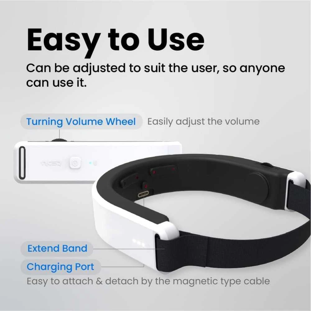 [User Friendly Interface] 1. Simply press the power button to start the Brain spa, and it can be stopped with just one press. 2. Sound can be conveniently adjusted with an easy-to-use volume wheel. 3. Elastic bands allow for easy size adjustment to wear the Brain spa on the head. 4. The Brain spa and magnetic charging cable are highly durable and robust.