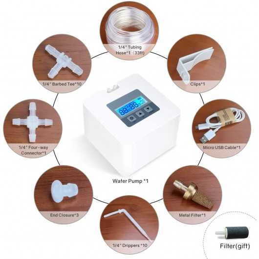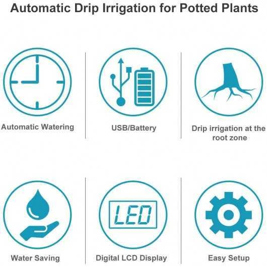 You can set your own watering program. The system offers 2 program settings for the timer: an hour mode that varies from 1 to 12 hours and a day mode that varies from 1 to 30 days that can water up to 10 potted houseplants. The controller is very easy to use, as you simply set your own watering program with the touch of a button. You can customize the number of times per day and the duration of watering. The system will then automatically water the pots at the scheduled time.