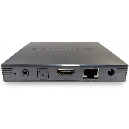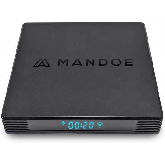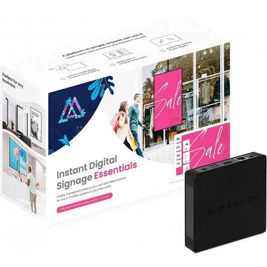 Mandoe is a box that connects to all advertising display devices through various inputs on one side of the device. It is powered by your power outlets and has an LCD screen to display the time and various data regarding internet connectivity.