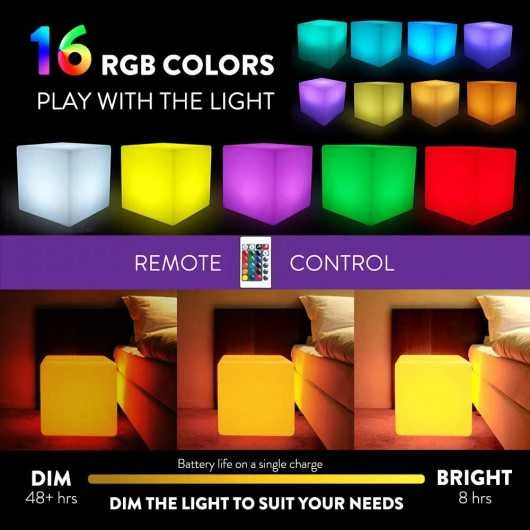 The cubic chair is made of BPA-free recyclable polyethylene plastic making it very resistant to falls, shocks and splashes thanks to its waterproof design and its IP68 protection rating allowing you to use it for both indoor and outdoor decoration. The remote control allows you to control the device remotely and also to turn it on or off, choose between the colors, the effects offered and the 8 levels of gradation.