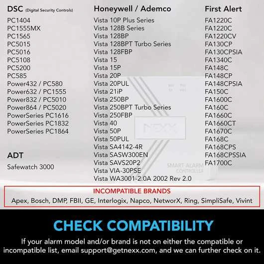 COMPATIBILITY CHECK & CONNECTION – 2.4 Ghz WiFi connection required. Nexx Smart Alarm Controller provides SMART functions to COMPATIBLE, existing alarm systems. COMPATIBLE with most DSC, Honeywell/Ademco, and First Alert brands – check Compatibility picture in the Amazon picture gallery or on GetNexx website. NOT COMPATIBLE with the following brands: Apex, Bosch, DMP, FBII, GE, Interlogix, Napco, NetworX, Ring, SimpliSafe, Vivint. PLEASE CHECK COMPATIBILITY BEFORE YOU BUY!