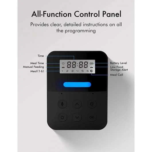 The PETLIBRO PL-AF003-01B allows you to offer up to 6 meals from 1 to 50 servings per day thanks to its 6-liter tank. The automatic feeder is equipped with an anti-jamming design thanks to a rotating motor that prevents all the kibbles from gathering in front of the hole causing a blockage. It has a 10-second voice recording function allowing you to call your dog or cat before eating, it has an LCD screen allowing you to program the device and make it easy to use. It is a device that is perfect for people who spend their day at work, going on vacation, etc..