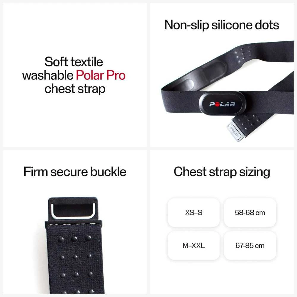 POLAR PRO CHEST STRAP: With improved electrodes, an easy-to-use buckle and silicone dots, the strap is comfortable and interference-free, and stays put when you’re on the move.