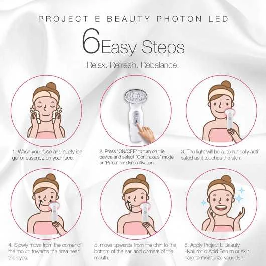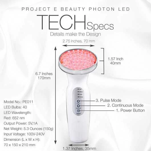 Project E PE011 is a device which has 40 LEDs that emit red light with a wavelength of 652nm, which can increase blood circulation and stimulate skin cells to excrete collagen for a firm and smooth texture.