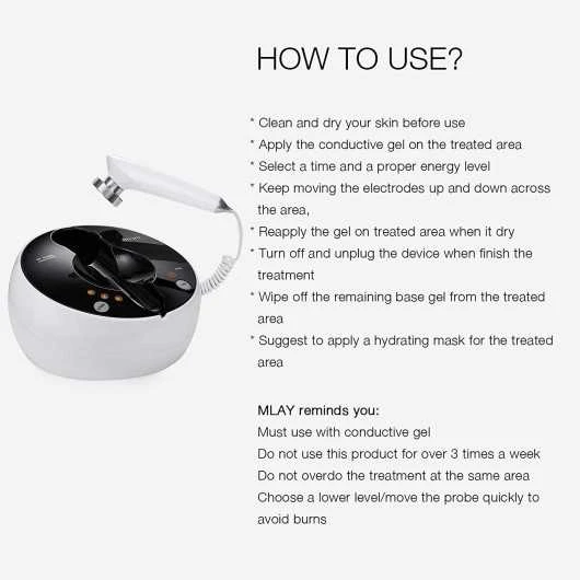 MORE COLLEGAN, LESS SAGGING & WRINKLES FOR FACE/BODY: MLAY professional radio frequency machine is not only a face machine but also a body machine, it has two treatment head – the smaller one is just perfectly sized for treating facial skin, forehead, eyes, cheek, jawline, chin and neck. The larger one with diameter of 1.77 IN, it is great for arms, legs, thighs, and tummy… It is very simple to use: only a couple settings, one for timer(10/20/30minites) and one for energy level(1/2/3)