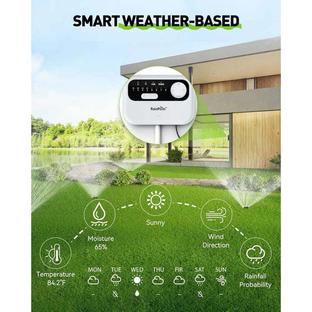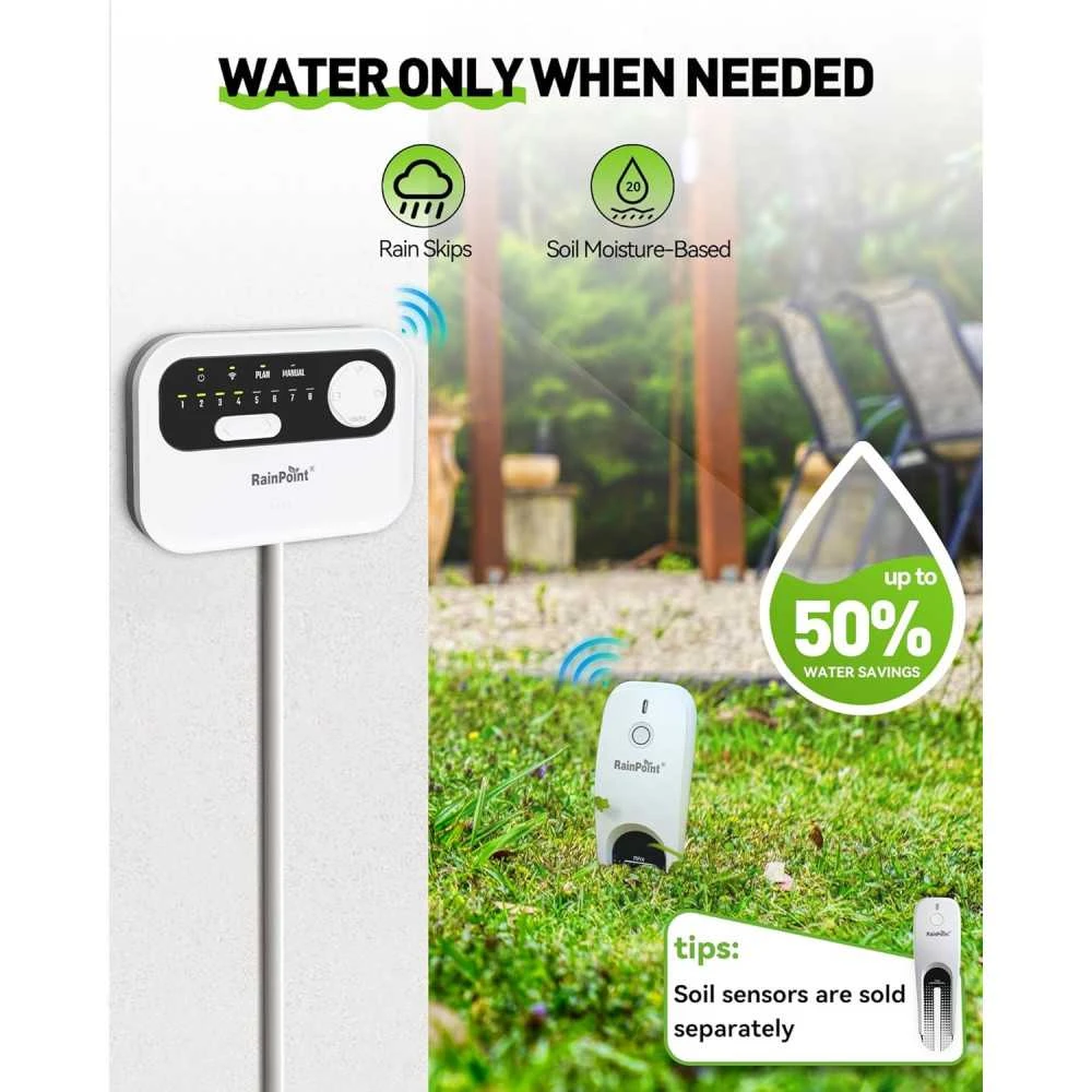 Soil-Based Smart Watering-When the WiFi irrigation controller is paired with the Rainpoint WiFi soil sensor (not included), it can automatically adjust the watering schedule according to the detected soil moisture, A great water timer for garden hose and keeping your soil moist but not soggy and avoid overwatering.