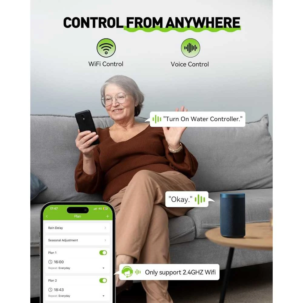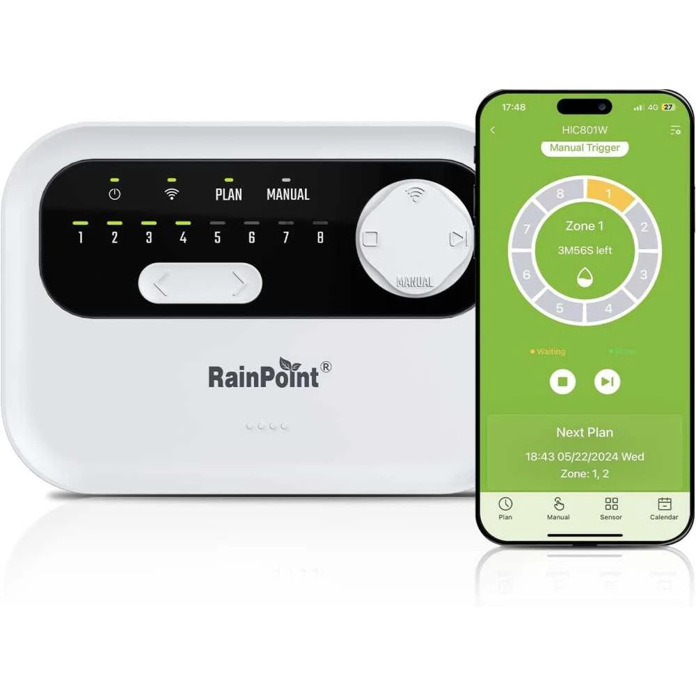 Control From Anywhere – Free App And Voice Control: RAINPOINT WiFi sprinkler controller supports 2.4GHz WiFi so you can manage your watering schedule effortlessly using the RAINPOINT SMART+APP. (Only support 2.4GHZ Wifi) Stay connected and in control whether you’re at work or on vacation. Share data with family or homeowners for collaborative landscape management. Monitor irrigation calendars and history to refine future schedules and maintain a healthy yard.