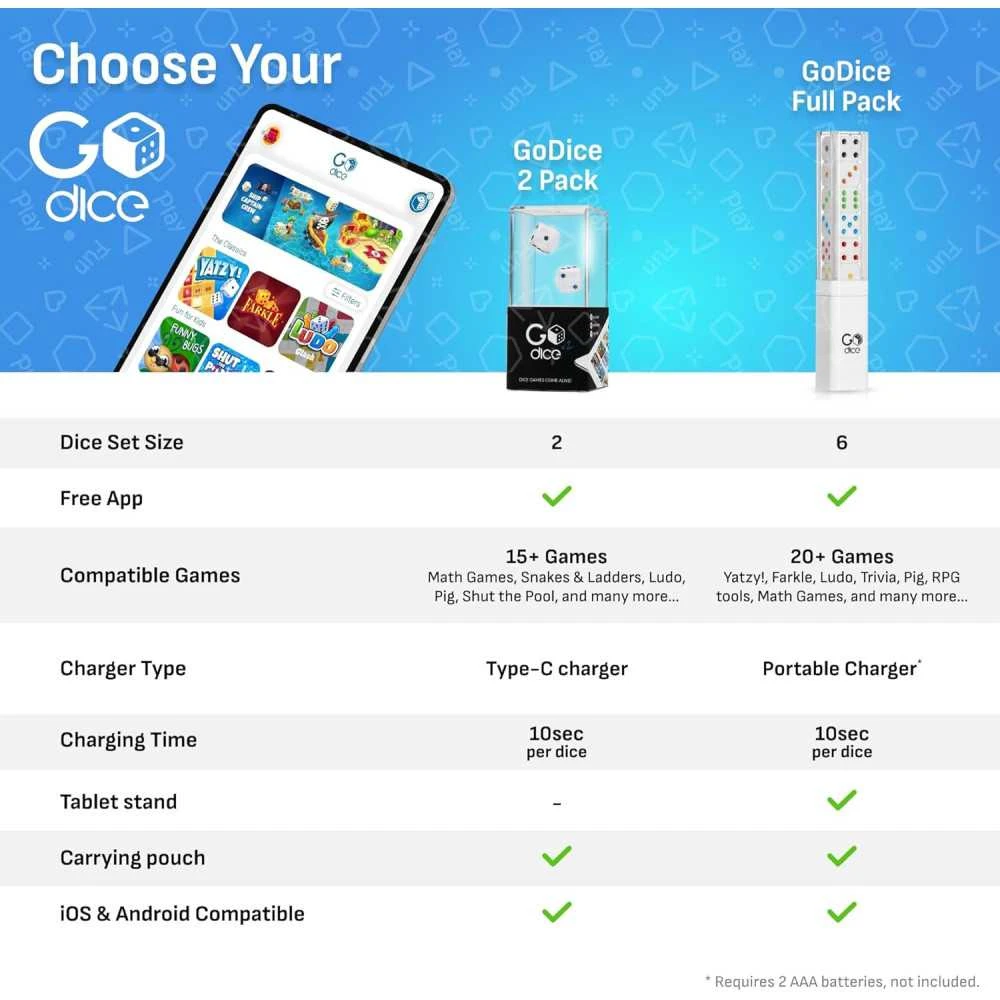 GoDice is a set of smart connected dice. They will turn your tablet into an entire game room that fits in your pocket. We recreate classic dice games, giving them a fresh and innovative feel, and bringing a whole new magical playing experience to the table. The GoDice companion app comes with 20+ FREE fun dice games, to play together with family and friends or by yourself. GoDice comes in a full pack of six dice or in a lighter pack of two dice to fit any pocket.