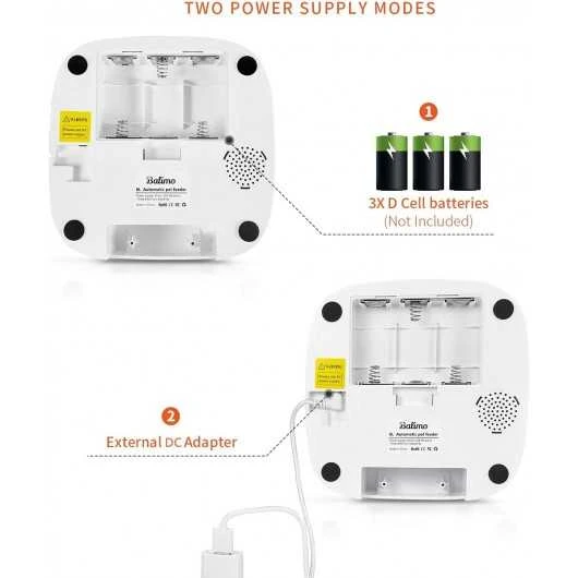 The cat food supports 2 types of power supply, the AC adapter and the 3D battery. Even after switching off, the feeder keeps the previous settings and does not need to be reset. The built-in infrared detector prevents overflow of the liner and is not blocked or leaked.