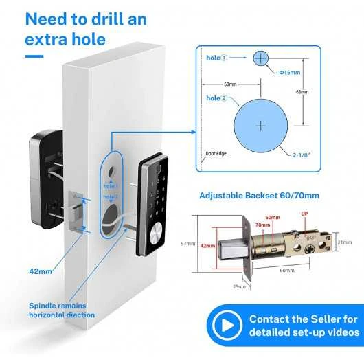 The device is easy to install, requiring only a few minutes and a screwdriver. It is suitable for doors with a thickness of 35-60mm with a hole diameter of 15mm for the top side and 54mm for the bottom side and a lateral bolt distance of 60-70mm. The device is made of zinc alloy and stainless steel which makes it durable and safe, it is powered by 4 AA batteries and has an emergency battery that can be recharged via a USB port located at the base of the device.