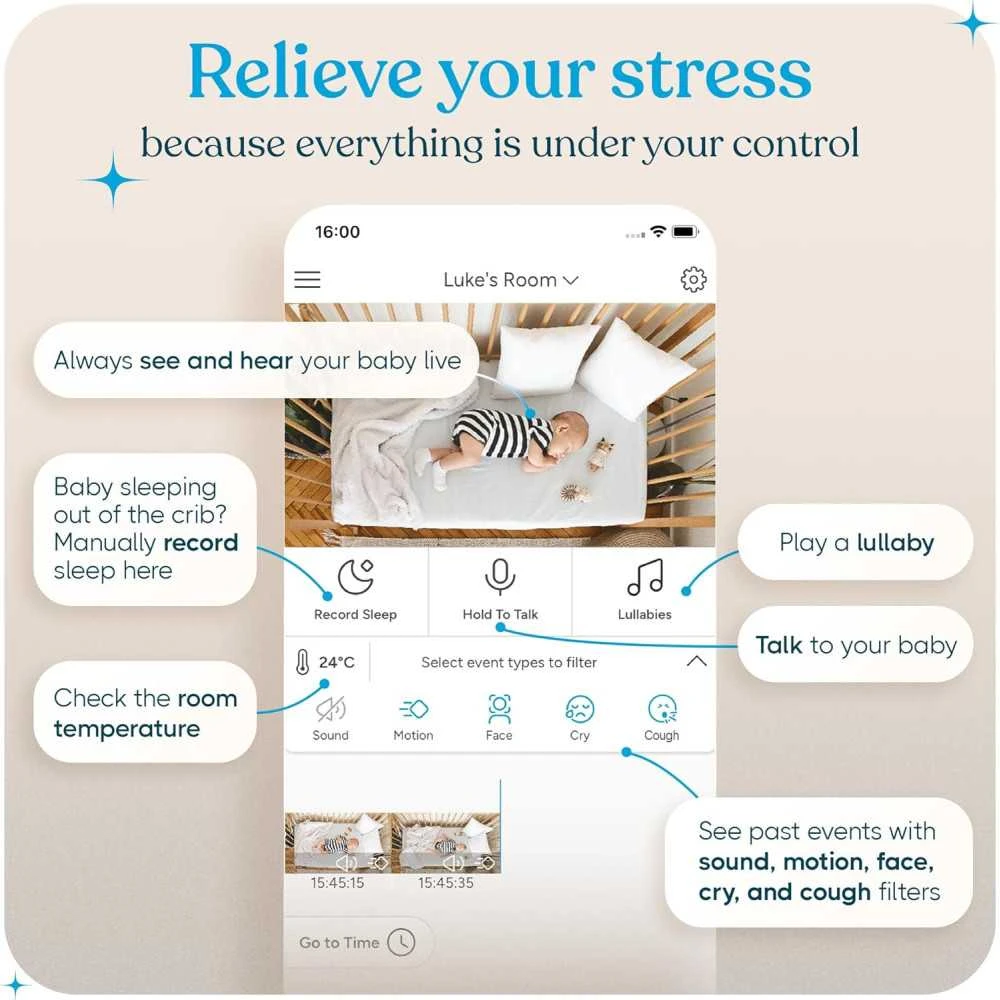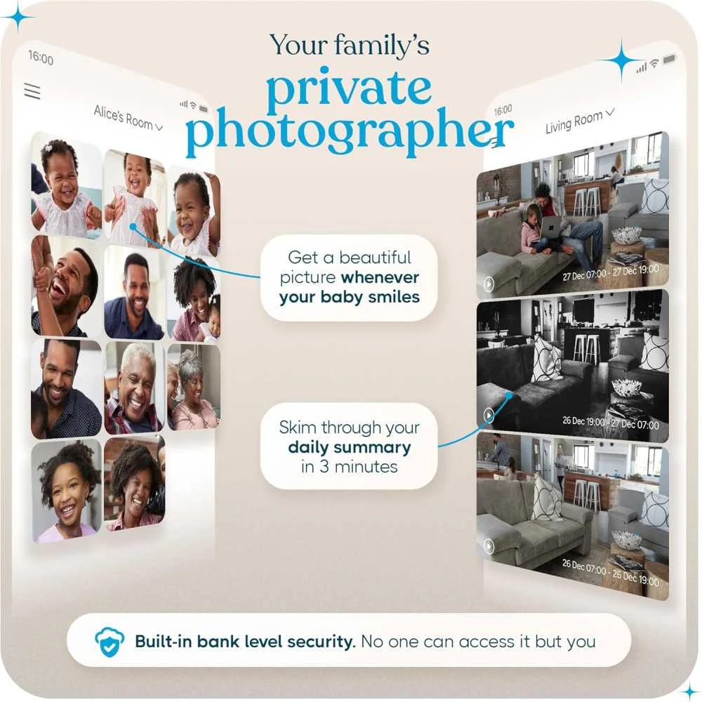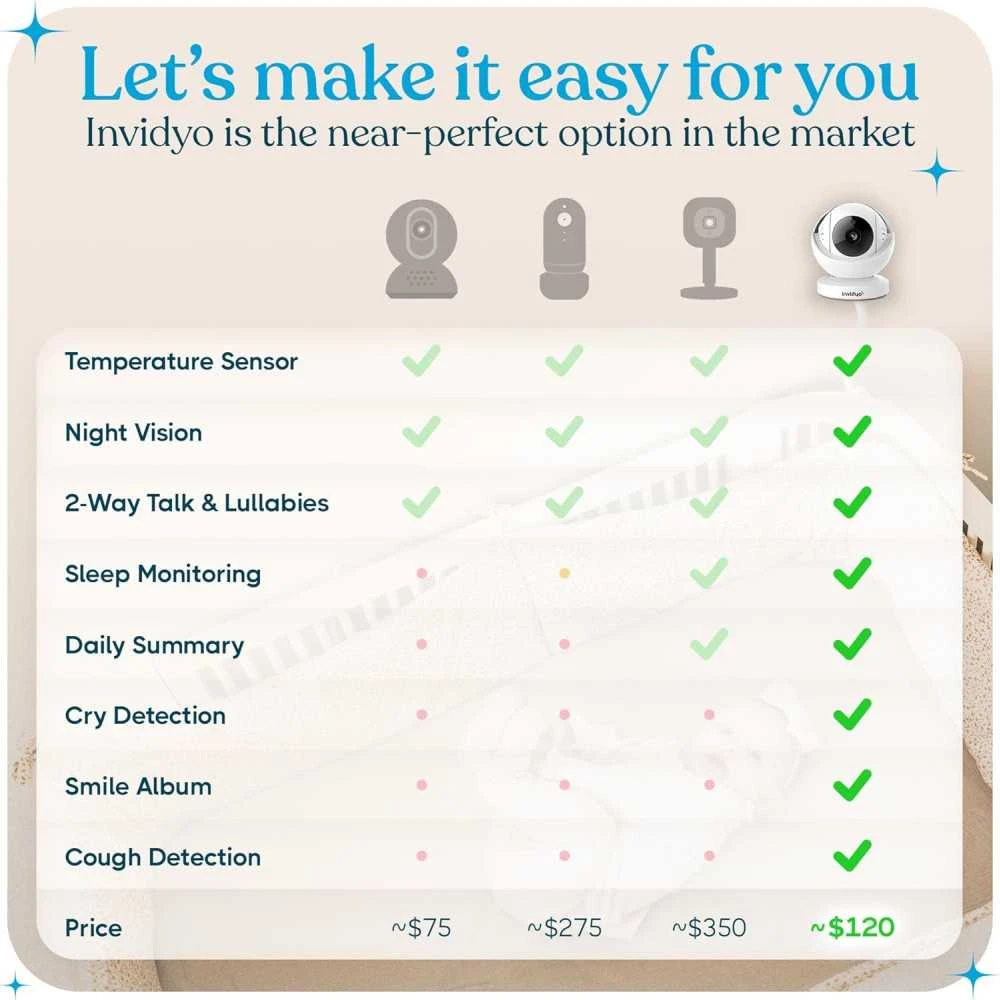 Unlike other baby monitors, Invidyo offers ADVANCED FEATURES AT A FRACTION OF THE COST. Automated contactless sleep monitoring, smart cry and cough analysis, smile albums, daily highlight videos, face recognition, and Alexa compatibility are just a few.