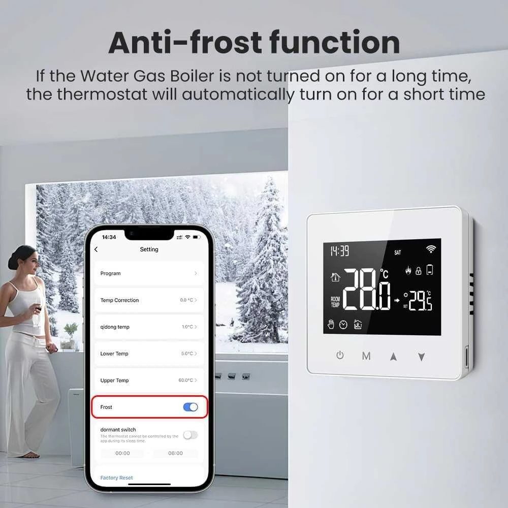 【Digital Thermostat with Large LCD Touch Screen】WiFi thermostat with LED touch screen makes it easy to adjust the temperature with just one click. Sensitive touch buttons regulate the temperature of the thermostat,thanks to the APP data statistics page, you can clearly see the time the boiler is turned on and the temperature curve of your home, as well as the graph of daily or monthly curve statistics.