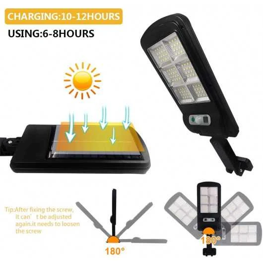 Gloriy Street Light is a solar street light with 96 LED beads that provides day white light with a 120°ultra-wide angle lighting. The efficient solar panels lights use polysilicon solar panels, which have high photoelectric conversion efficiency. That makes it work even on cloudy days. The light built-in larger battery (6000mAh) provides faster charging and long endurance. Thanks to the 180° motion angle, you can adjust the solar panel angle for the best daylight exposure. The flexible angle can meet different needs to make sure your light is always convenient for you.