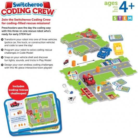 This three-in-one coding robot is ready for coding-filled rescue missions! Preschoolers save the day the coding way when they explore early STEM fun with the Switcheroo Coding Crew from Learning Resources. Here’s how each mission with this coding toy for kids unfolds: kids draw a coding rescue challenge card, transform their coding robot into one of three vehicles (police car, fire truck, or construction vehicle) and code to save the day! Along the way, they’ll learn new skills, from 100% screen-free STEM and coding to critical thinking, logic, and more! When they’re not saving the day in Code Mode, kids can also snap a new vehicle shell onto their coding robot and discover the light, sounds, and tricks of Play Mode. Each vehicle shell comes with its own cool secrets! The Switcheroo Coding Crew comes with a 46-piece interactive playset, so kids can follow along with challenges or design their own STEM and coding rescue challenges!