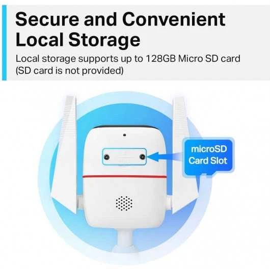 This is a camera that has an IP66 rating that works even in harsh environments with rain and dust. It uses wired connection life an Ethernet cable and wireless via Wifi connectivity plus a possibility of connection with the entire Tapo ecosystem. It has an SD card slot that can accommodate up to 128GB capacity to store all your data and a bracket that allows you to attach it to any wall with screws.