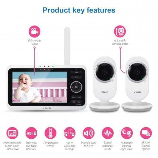 VTech VM350-2 is a set of two baby cameras and a monitor that connects to each other using wireless connectivity. This is the perfect kit to always be connected with your child no matter where you are in any room of the house.