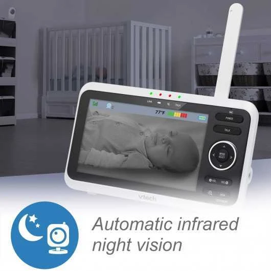 The VTech VM350-2 consists of two cameras and a 5-inch monitor that allow you to monitor your children’s room in real time. Each camera features automatic night vision with an infrared LED, so you can always see your baby clearly in low light environments. They also feature a microphone and speaker for two-way communication, 5 lullabies and 4 sets of ambient sounds including white noise and trickle to lull your baby to sleep or cry. Both cameras include a temperature sensor, so you know when to change the thermostat to ensure your child is always in the best possible comfort.