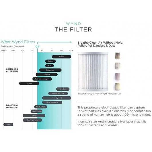 The device traps particles such as pollen, pet dander, bacteria, brush fire smoke and industrial pollution particulates. They can come from sources like traffic, factories and power plants. Thanks to its medical grade filter, it removes airborne pollutants, including germs, dust and more. Through the Wynd app, you can unlock even more features like remotely controlling your Plus and viewing air quality data from your device. It removes pollutants from your personal space in no time thanks to its design from NASA and MIT that is powerful enough to remove 99% of pollutants in a car cabin in under 15 minutes. It even fits in a cup-holder so you can take clean air with you wherever you go. It removes 99% of particles over 0.3 microns which is the typical size of pathogen-carrying respiratory droplets. Using anti-microbial silver, it destroys the infectious germs it captures. You can protect yourself and give your immune system the support it needs.